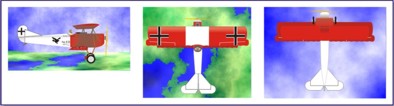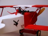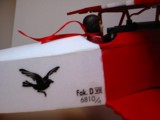 Das Bemalungsschema: Die Bemalung entspricht in etwa der Maschine von Leutnant August Raben, dem Staffelführer von Jasta 18. Sein Kennzeichen war der Rabe. Lt. Raben flog zuvor einen Fokker Dr.1 Dreidecker mit hellblauer Bemalung und einem weißen Raben auf blauem Grund. Auch gibt es Albaros DV Maschinen in der “Jasta Raben” Bemalung: Rote Flächen, roter Rumpfvorderteil, weißer Rumpfhinterteil und den schwarzen Raben als Insignie. Die Seriennummer ist ebenfalls frei erfunden. Auch der weiße Mittelteil der oberen Tragfläche war beim Original rot, so sieht aber die Maschine hübscher aus. Flugeigenschaften: Bodenstart: Nein, auf Rasen nicht möglich. Die Räder sind schmal und haben keine 6 cm Durchmesser. Dafür funktioniert der Handstart umso besser! Die Maschine zieht bereits mit 1/3 Gas kerzengerade weg. Mit den 8 Zellen hat die Maschine mehr als genung Power und ist über 10 Minuten unterwegs! Die meiste Zeit benötigt man nur 20-25% Gas. Trotz passendem Schwerpunkt hängt die Maschine sehr am Propeller. Wie das Original ist die Maschine sehr wendig. Die Steigleistung ist phänomänal (45°), die Langsamflugeigenschaften sind gut, aber klarerweise nicht so extrem wie bei einem Slow-Flyer mit einem Drittel der Flächenbelastung. Diese kleine Fokker hat zwei Tücken: Im Langsamflug, kurz vorm Überziehen, geht sie nach rechts weg. Das heißt, will man auf einer schönen Geraden Linie einschweben, dann muss man viel mit Seitenruder arbeiten, um auf Kurs zu bleiben. Die zweite Eigenheit ist, dass sie sich gut in die Kurve legt - und gar nicht wieder heraus will! Klar, wie beim Original gibts kein V, jedoch ist hier die Situation recht brenzlig, da die Maschine bei niedriger Gasstellung in der Kurve sehr viel Höhe verliert. Zieht man in der Kurve dann noch stärker, dann sinkt die Maschine noch schneller! Gibt man mehr Gas, dann fliegt man im Messerflug. Aber da reicht dann manchmal nicht mal Vollgas aus. Einzige Lösung: Mit Querruder die Maschine wieder aufrichten. Wenn man diese "Ungezogenheiten" kennt, dann sind sie aber kein Problem. Kurven leitet man mit Seite und Querruder ein, in der Kurve selbst steuert man bereits etwas Quer dagegen und kann mit Höhte und Gas den Radius bestimmen. Zu Anfangs hat man das Gefühl, das die Maschine wahnsinnig "schiebt", jedoch ist das kein Nachteil, sondern eine Grundvoraussetzung für ihre Wendigkeit. Wird die Maschine schwungvoll geflogen, dann braucht man nur minimalste Ruderausschläge. Fliegt man sehr langsam und läßt die Maschine in den Wendemanöver auch ab und zu mal am Propeller hängen, dann muss man anständig mit den Hebeln rühren. Mit den beiden typischen E-Flyer Propeller von Graupner 23x12 (9x5) oder 20x15 (8x6) hatte ich zwar schöne Flüge, aber irgendwie fehlte im Kunstflug die Kraft. Beim Looping war nach dem ersten Viertel kein Schub mehr da, es gelangen nur kleine Überschläge. Das Upgrade auf 10 Zellen half ein wenig, war aber nicht die ideale Lösung. |