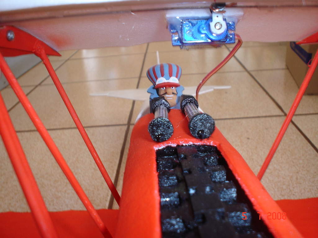 Ein 800mAh 2s Akku reicht auch und kann ganz nach vorne gerückt werden, sodass der Schwerpunkt "gut genug" erreicht werden kann und die Maschine nicht agressiv zappelig wird, sondern noch immer sehr stabil und gutmütig bleibt. Loopings kommen gut, Rollen brauchen halt etwas Anlauf. Die eigentliche Sensation ist, dass dieses Modell nun mehr als 18 Jahre auf dem Buckel hat und noch immer perfekt fliegt. Das stellenweise etwas vergilbte Klebeband für die Ruderscharniere musste irgendwann durch ein neues ersetzt werden, aber ansonsten ist die Maschine am Stand von 2004 - also 16 Jahre ohne Veränderung und fliegt "flawless"! Mittlerweile hab ich eine bessere Kamera (und die Kinder sind erwachsen) und somit gibt es nun bessere Fotos, selbstverständlich auch vom Flug!