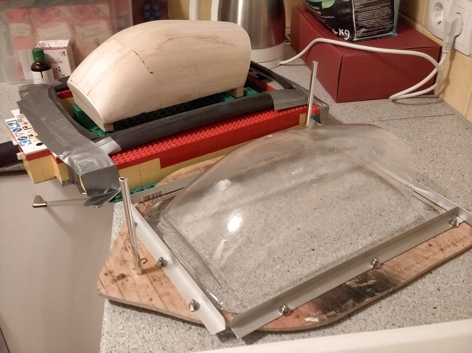 hab ich mich entschlossen, das Gewerbe des Tiefziehers auch zu erlernen! Als Ausgangsmateriel für die eigenen Hauben verwende ich Vivak 08 oder 1,0 mm stark. Das Vivak wird in einem speziell angefertigten Rahmen mit 4 Aluleisten verschraubt, dann 2-5 Mnuten im Backrohr bei 140° Celsius mit Umluft erwärmt - so lange, bis das Material 7-10 cm durchängt - und dann mit elegantem Schwung über die Balsa-Form gedrückt. Nach dem ersten Tiefziehvorgang stand fest, dass das nix werden kann, da das Vivak sich nicht freiwillig links und rechts an die Kabinenhaube anlehnt. Es wird also nötig sein, das zu machen, was alle machen: Mit Unterdruck tiefziehen! Gelöst hab ich das mit Lego, einem Staubsauger und alten Fahrradschläuchen als Dichtgummi (siehe Fotos). Jetzt wird eine von drei Versuchen schon brauchbar... aber ich glaub, ich muss noch ein wenig üben... ![]() ![]() ![]() ![]() ![]()