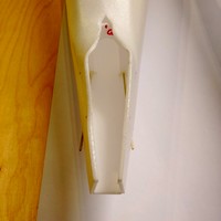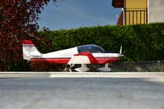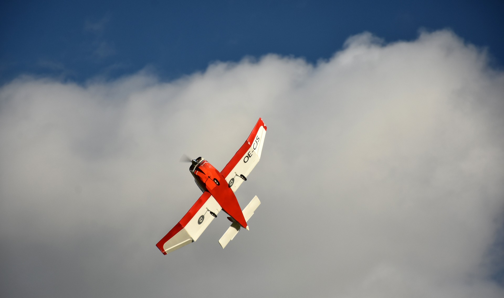 Aus 3mm Depron hab ich noch Sitze gebaut, blau lackiert und mit Klettverschluss befestigt. Das Armaturenbrett ist ebenfalls aus Depron und wird mit dem Cockpit-Bild beklebt und auch mit Klett einfach reingesteckt. Die Fahrwerksrohre (4mm CFK-Rohr) werden am unteren Ende mit einer ca. 5mm langen Messinghülse mit Innendurchmesser 4mm geschützt. Die Messinghülse erhält vor dem Verkleben mit UHU Endfest 300 bereits die 2mm Bohrung für die Radachse. Muss natürlich nach dem Verkleben nachgebohrt werden... Radachse ist übrigens eine 25mm lange 2mm Schraube. Die Radverkleidungen sind so konstruiert, dass sie nur aufgestekct werden müssen. Das besondere an der Konstruktion ist auch, dass die Verkleidungen am 3D-Drucker ohne künstliche Stützen gedruckt werden können. Zwar gelingt da nicht jeder Ausruck - und der Abschluss oben ist auch nicht immer fehlerfrei, aber mit etwas manueller Nacharbeit werden die Teile ganz schön und erträglich schwer: 17g je Stück. Die Kabinenhaube wird nicht nur durch Magnete gehalten. Vorne, auf der Motorhaube ist ein 2,5cm langer, 1,5mm breiter SChlitz (quer zur Flugrichtung), durch das Klebeband führt, welches an einem Ende die Kabinenhaube hält und am anderen Ende Klettverschluss im Rumpfinneren besitzt. Das hält. Übrigens werden auch die Flächen mittels Klettverschluss im Rumpf gehalten. Hier kommt wieder das Glasfaserverstärkte Klebeband zum Einsatz. Ebenfalls mit Klett wird der Akku angebracht. Bei mir liegt er direkt zwischen Höhen- und Seitenruderservo, unter den hinteren Sitzen. Nur so konnte der Schwerpunkt - der laut Plan genau am Hauptholm liegen soll - erreicht werden. Die rote Farbe wird mit Styro-verträglichem Spray aufgetragen; der schwarze Zierstreifen aus selbstklebender Folie - die aber nicht immer so von selbst kleben will - was man aber mit etwas UHU POR ausgleichen kann. Und so sieht das Modell dann fertig aus: Flugeigenschaften: Bodenstart am Asphalt: langsam anrollen...mehr Gas...leicht mit Seite korrigieren zum Geradehalten... rollt schon ein ganzes Stück, und das schon eigentlich schnell genug... anständig ziehen und sie fliegt! Und das war erst ein wenig mehr als Halbgas! Seite und Quer muss etwas nachgetrimmt werden, aber Höhe/Anstellwinkel/Motorsturz scheinen zu passen. Alle Ruderausschläge kommen klar an - nicht so brutal wie bei den 3D Fliegern, aber auch nicht schwammig. Die Maschine lässt sich unglaublich präzise steuern. Fühlt sich nicht wie ein Park-Flyer, sondern eher wie ein Großmodell an. Die Wendigkeit ist super - einzig bei großen Kurven mit relativ viel Schräglage, da verliert die Maschine an Höhe. Sie "stützt" sich doch nicht sooo stark am Knickflügel ab wie vielleicht erwartet. Abhilfe schafft hier, die Kurven stärker mit Seite zu fliegen. Insgesamt ist das Flugbild aber sehr beeindruckend. Mit 20% Gas schnurrt die Maschine in Augenhöhe stoisch vorbei - der voluminöse Rumpf kommt voll zur Wirkung. Phantastisch. Und dann das Landen. Darauf hab ich mich schon am meisten gefreut und die Erwartungen sind sogar noch übertroffen worden. Man kann wunderschön einschweben! Mit zwei Rädern aufsetzen und dann das Bugrad absenken. Das gelingt auch OHNE den Bremsklappen! Die Klappen können ca. 70° nach unten gefahren werden, aber das ist nicht mehr "schön" zu fliegen, da es zu sehr bremst und man braucht mehr Gas, damit die Maschine normal fliegt. 30° Ausschlag reichen zum Landen; 15° für schöne Starts. Der Schwerpunkt direkt am Hauptholm passt übrigens perfekt. Im Laufe der Saison hab ich eigentlich nur drei kleine Verbesserungen angebracht: